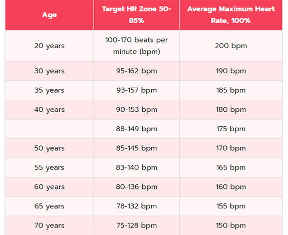 ตารางที่ 1 แสดง ถึง Target heart rate zone ที่แนะนำให้ออกกำลังกาย และ maximum heart rate แบ่งตามอายุ