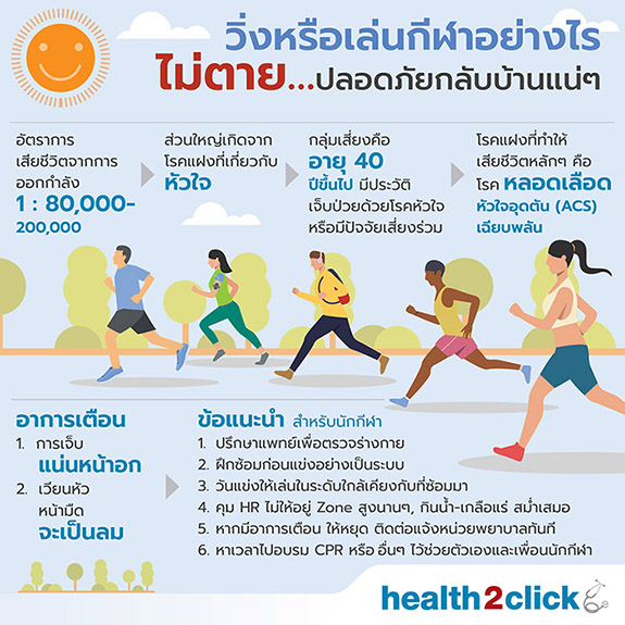 สำหรับการเสียชีวิต ซึ่งเกิดในระหว่างการแข่งขันกีฬา เช่น การวิ่ง การเตะฟุตบอล การเล่นแบดมินตัน โดยเฉพาะในการวิ่งระยะไกล ๆ นั้น มักจะมาจากโรคแฝงที่เกี่ยวกับหัวใจเป็นหลัก โดยมีโอกาสเกิดสูงในผู้ที่อยู่ในกลุ่มเสี่ยง เช่น ผู้ที่มีอายุ ตั้งแต่ 40 ปีขึ้นไป มีประวัติเจ็บป่วยด้วยโรคหัวใจ หรือมีปัจจัยเสี่ยงอื่น ๆ เช่น
